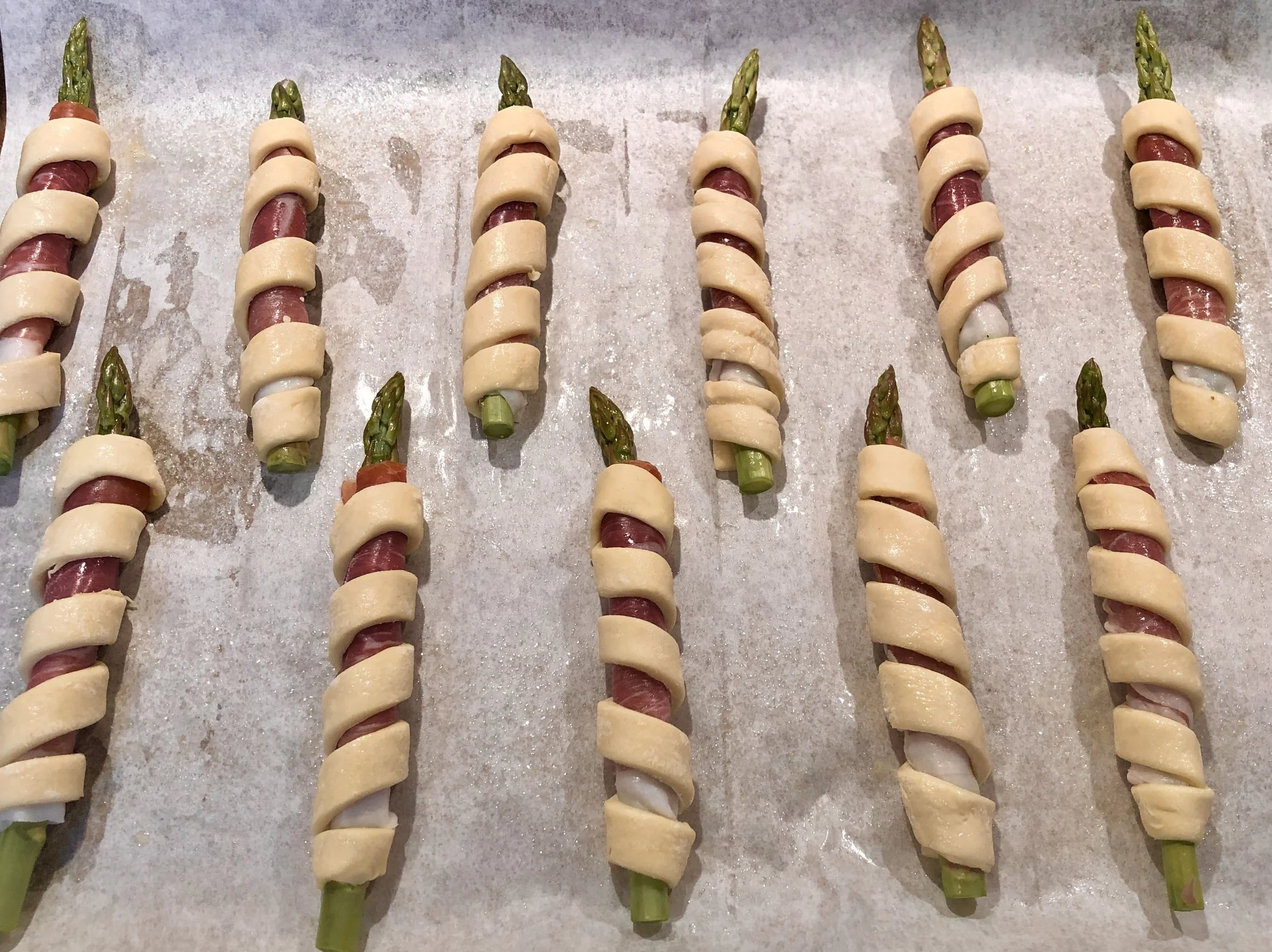 Once the dough is wrapped around the prosciutto asparagus bundles, it’s best to cook them. But if you’re cooking them ahead of serving day, slightly underbake them so they are light brown rather than golden.
