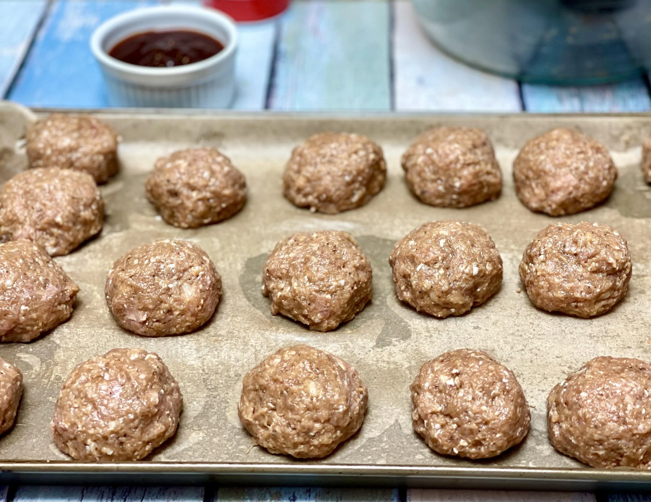 7. Roll the portioned meat into evenly sized meatballs, and place them back on the prepared baking sheet, leaving a little space between each meatball.
