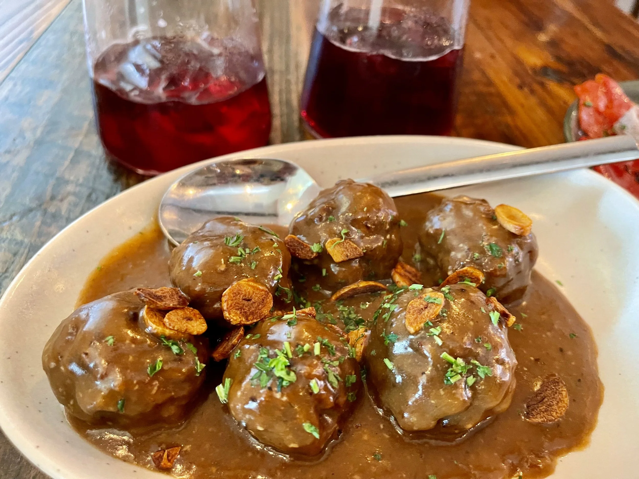 The sweet peppers played perfectly off of the tangy anchovies with their briny slap. The lamb and chorizo meatballs were delicious, topped with roasted garlic slivers and drenched in a soulful Salsa Española. And the rich chorizo and sweet clams in a lovely white wine broth were the third big hit on this delectable winning streak. The only downside was that we were now too full to try any of the Basque chorizo sandwiches.