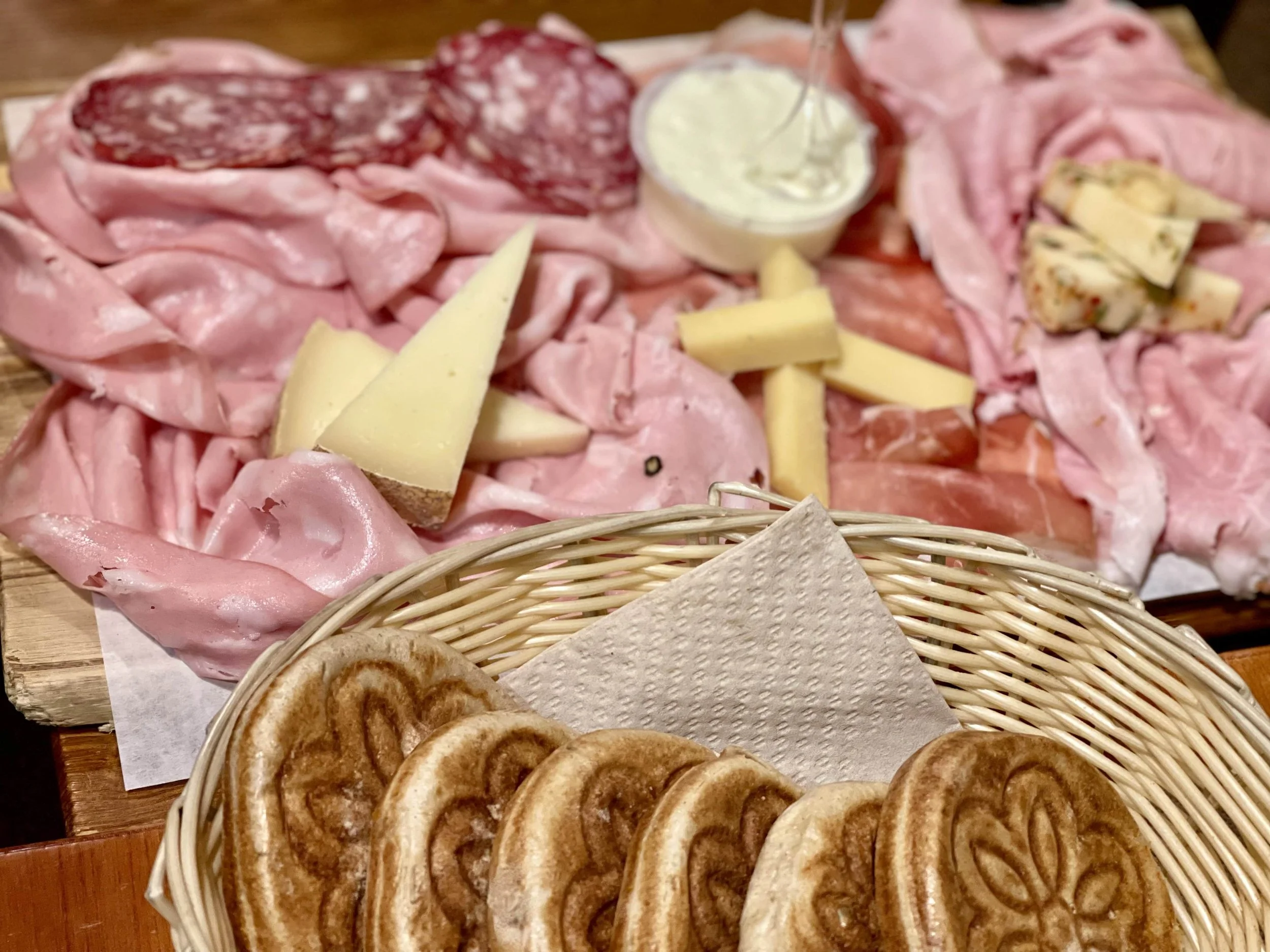 Charcuterie and wine at one of our favorite restaurants in Lucca, Italy.