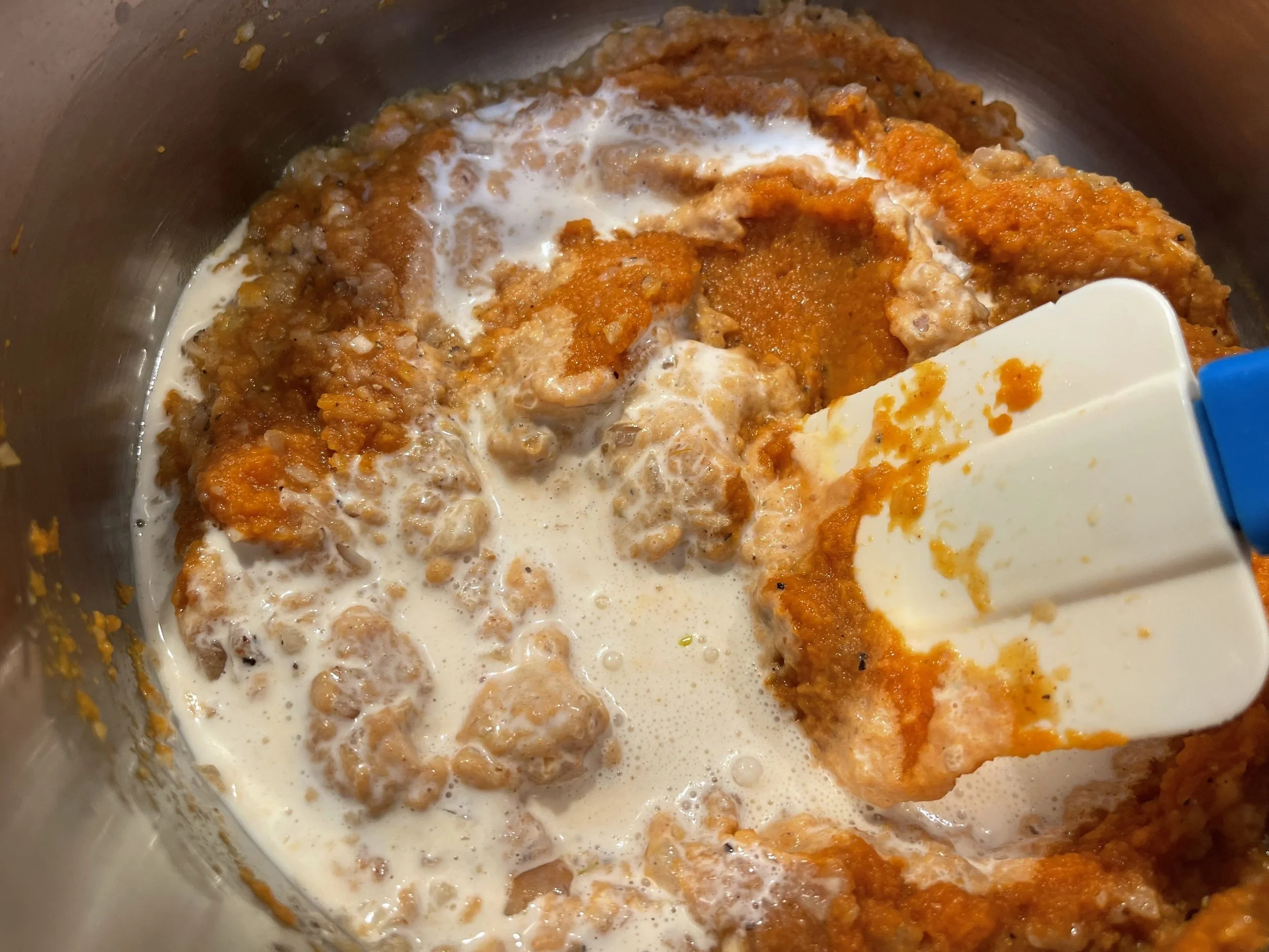 4. Turn the heat to medium, add the pumpkin and milk, then stir thoroughly. Cook another 5 minutes.