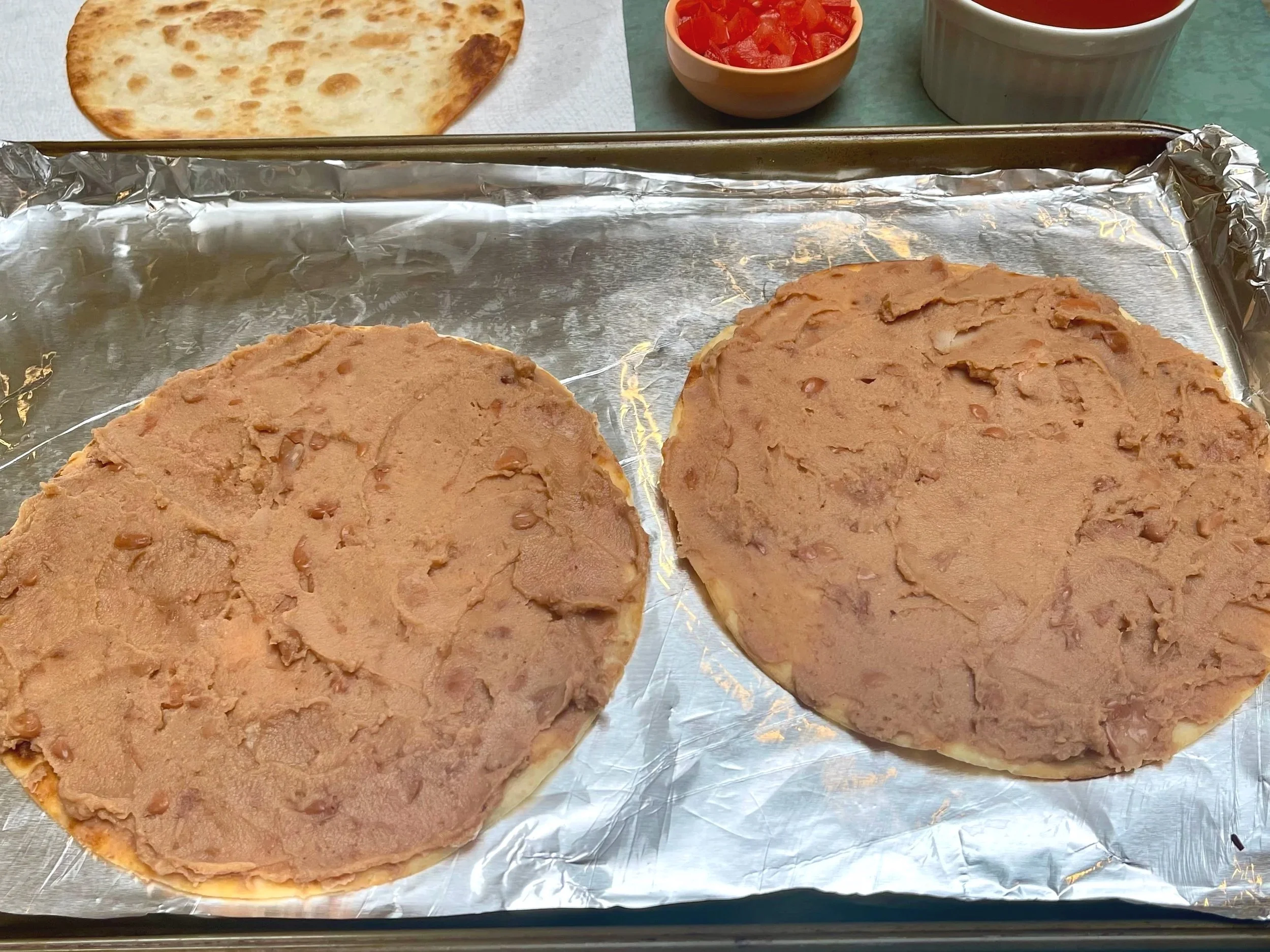4. Spread the beans: Place two of the crispy tortillas on the baking sheet. Using a spoon or silicon spatula, spread a layer of refried beans over each. It’s like icing a cake, but don’t worry about precision.