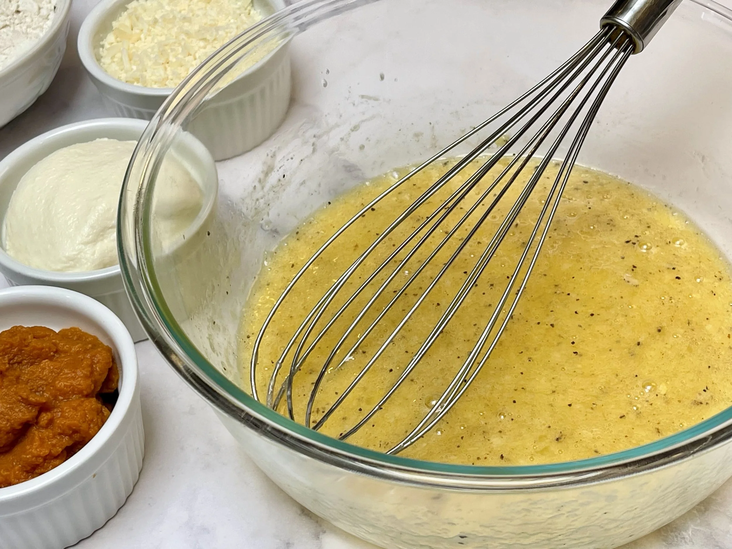 1. In a large mixing bowl, whisk together the eggs, melted butter, kosher salt, black pepper, and nutmeg until well combined.