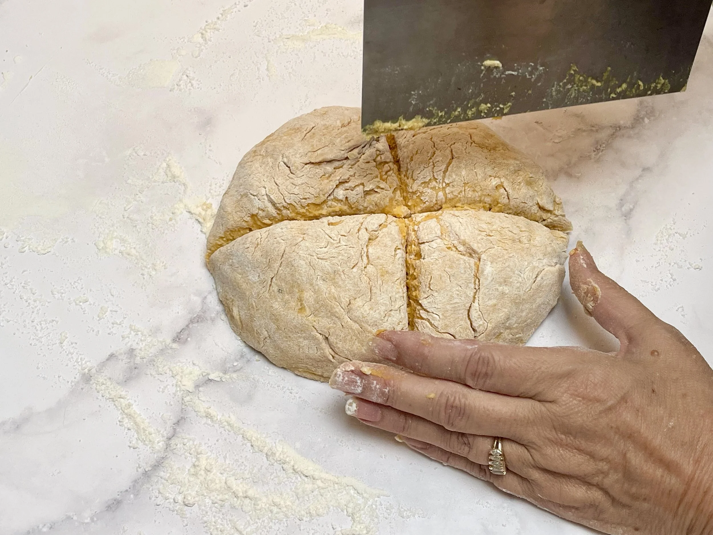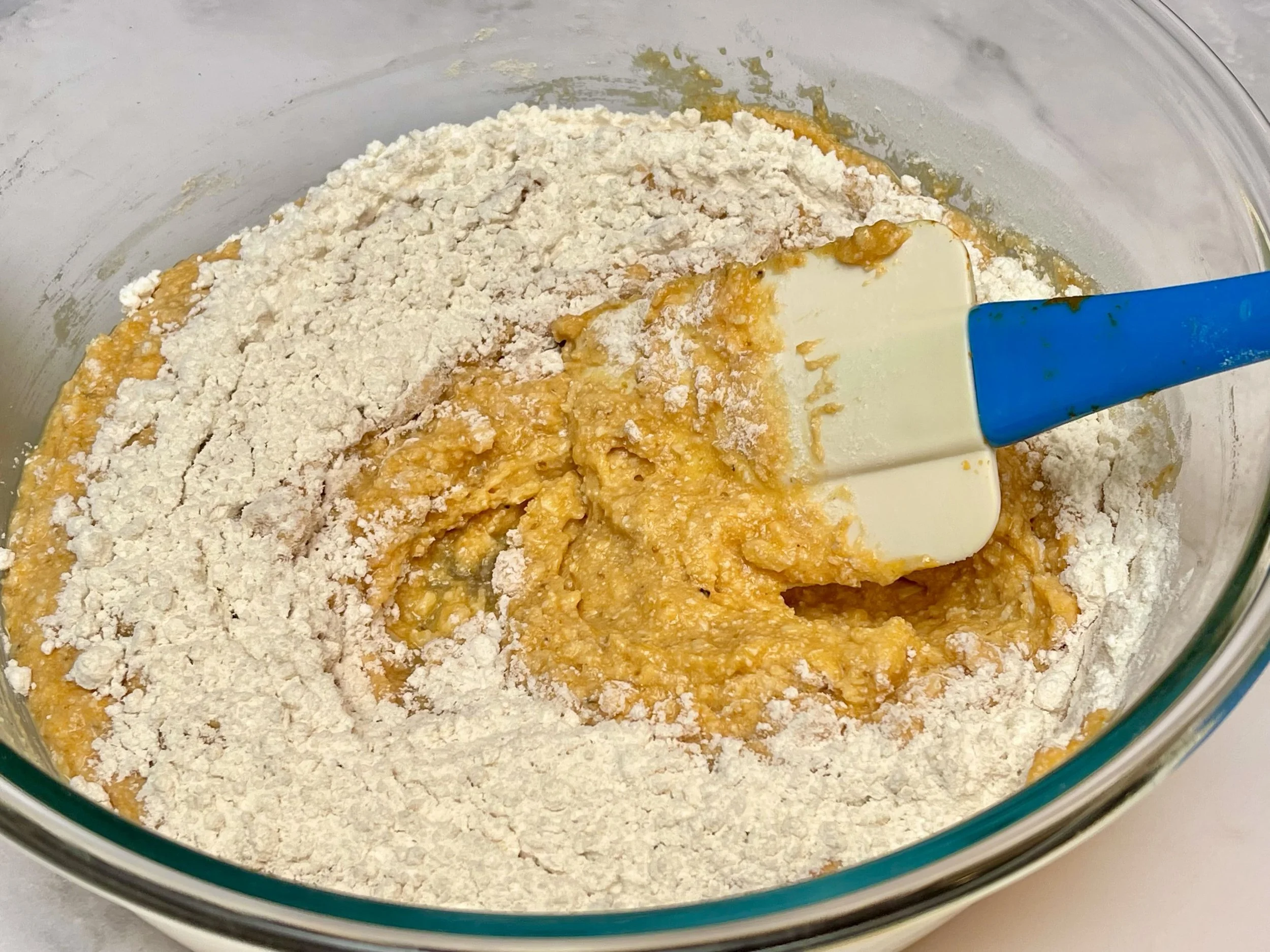3. Gradually add the all-purpose flour to the large bowl, about ½ cup at a time, mixing gently after each addition with a silicon spatula or wooden spoon. Continue until a soft, slightly sticky dough forms.