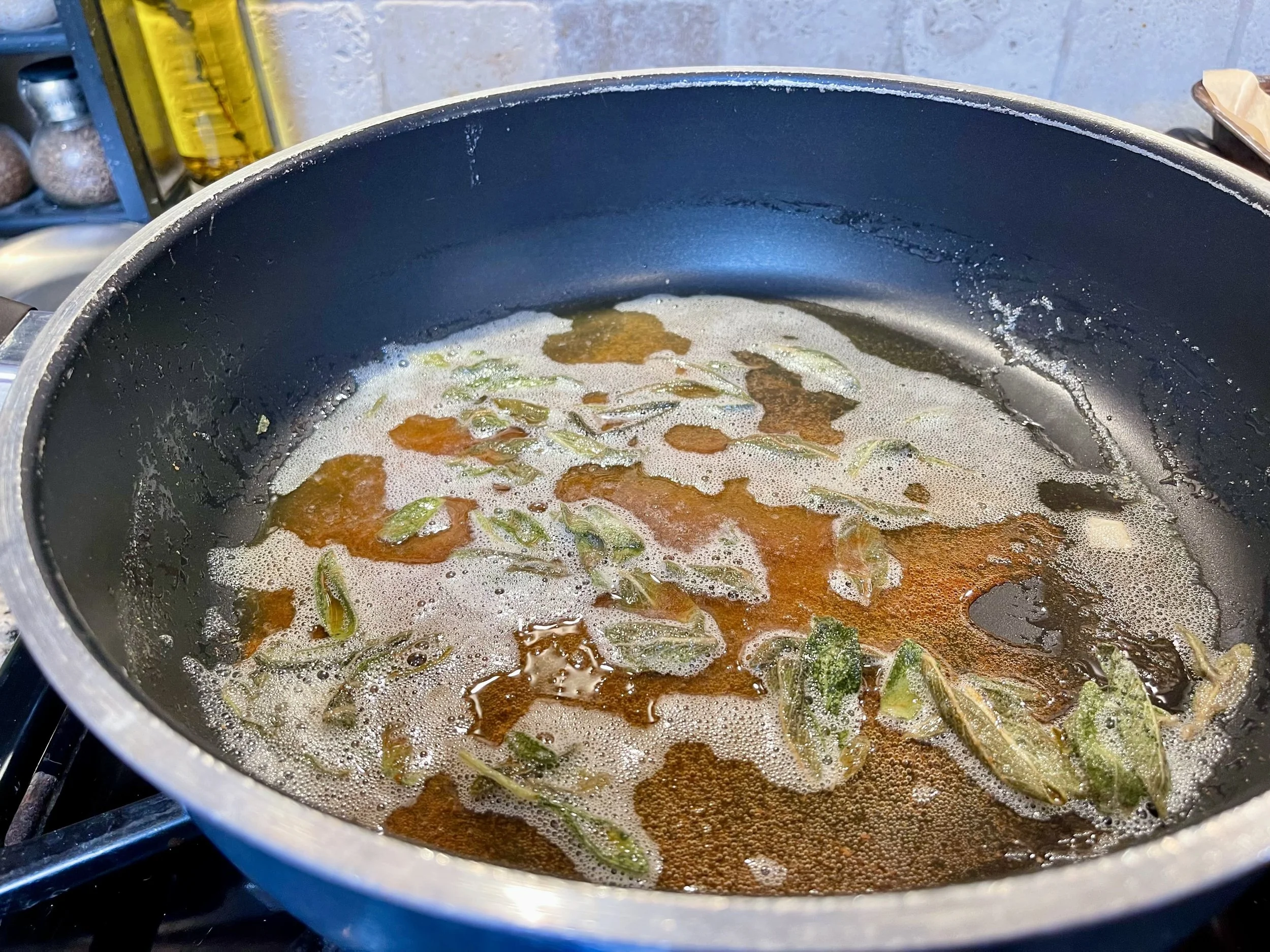 12. Once the butter is golden brown and fragrant, add the fresh sage leaves to the skillet. They will crackle and pop. Cook for about 1–2 minutes, stirring gently, until the leaves become crisp and aromatic.