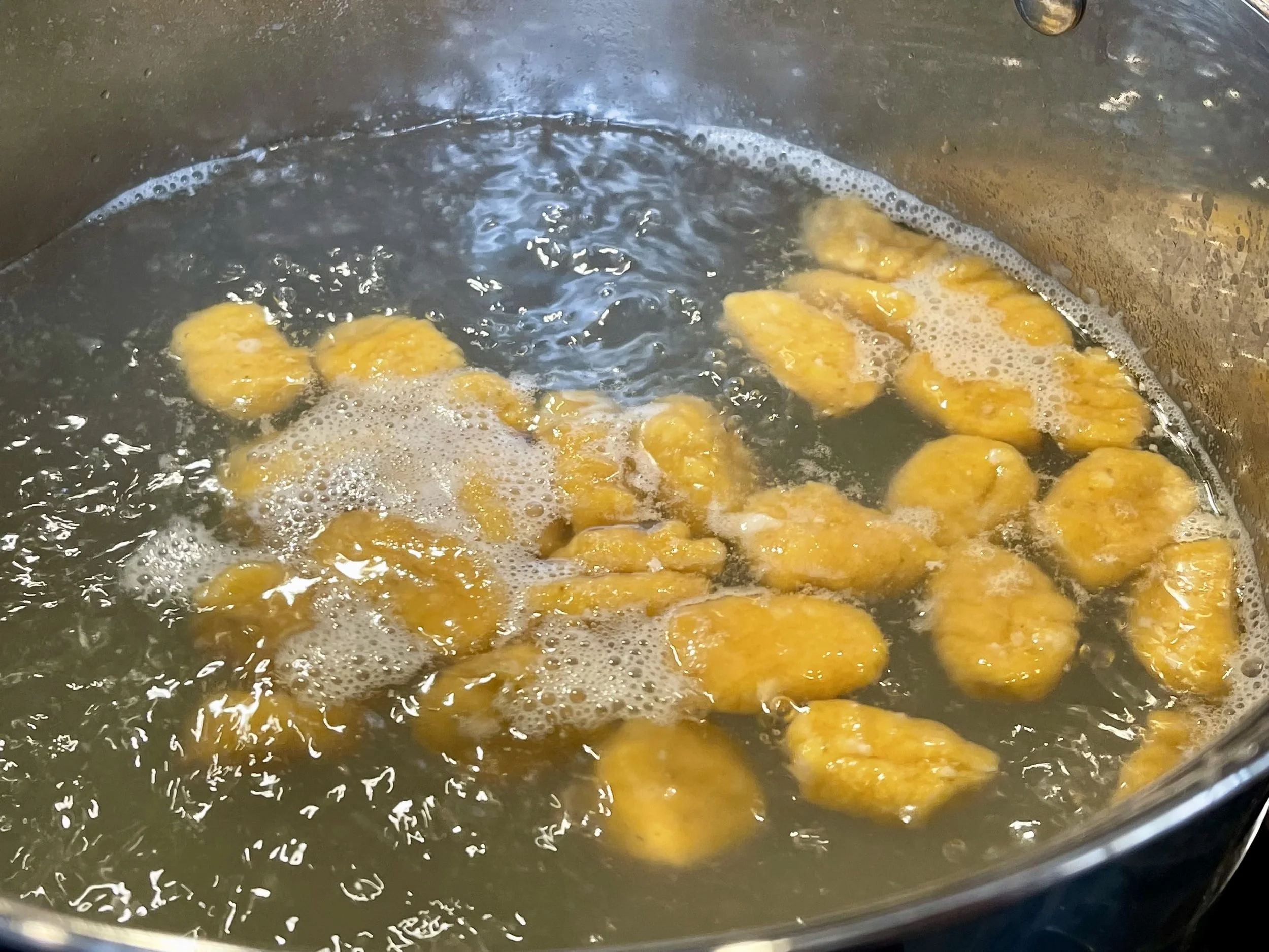 8. When all of the gnocchi are formed, add them to the boiling water in batches of about 25. Cook until all of the gnocchi float to the top of the pot, about 2–3 minutes.