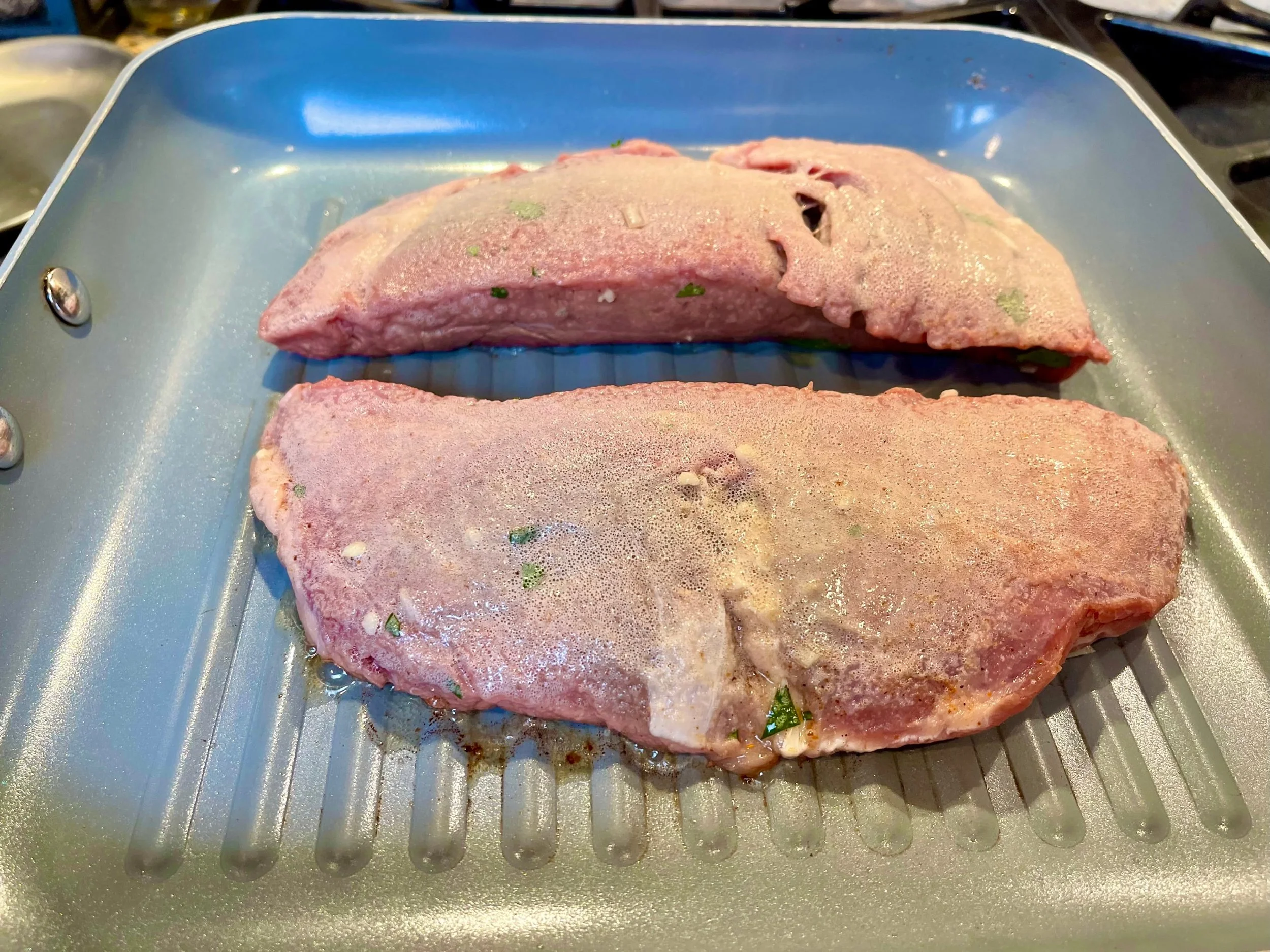 3. Heat a large cast iron skillet or grill pan over medium-high to high heat until very hot. I like ribbed grill pans because the sear you get mimics what you get with a grill.