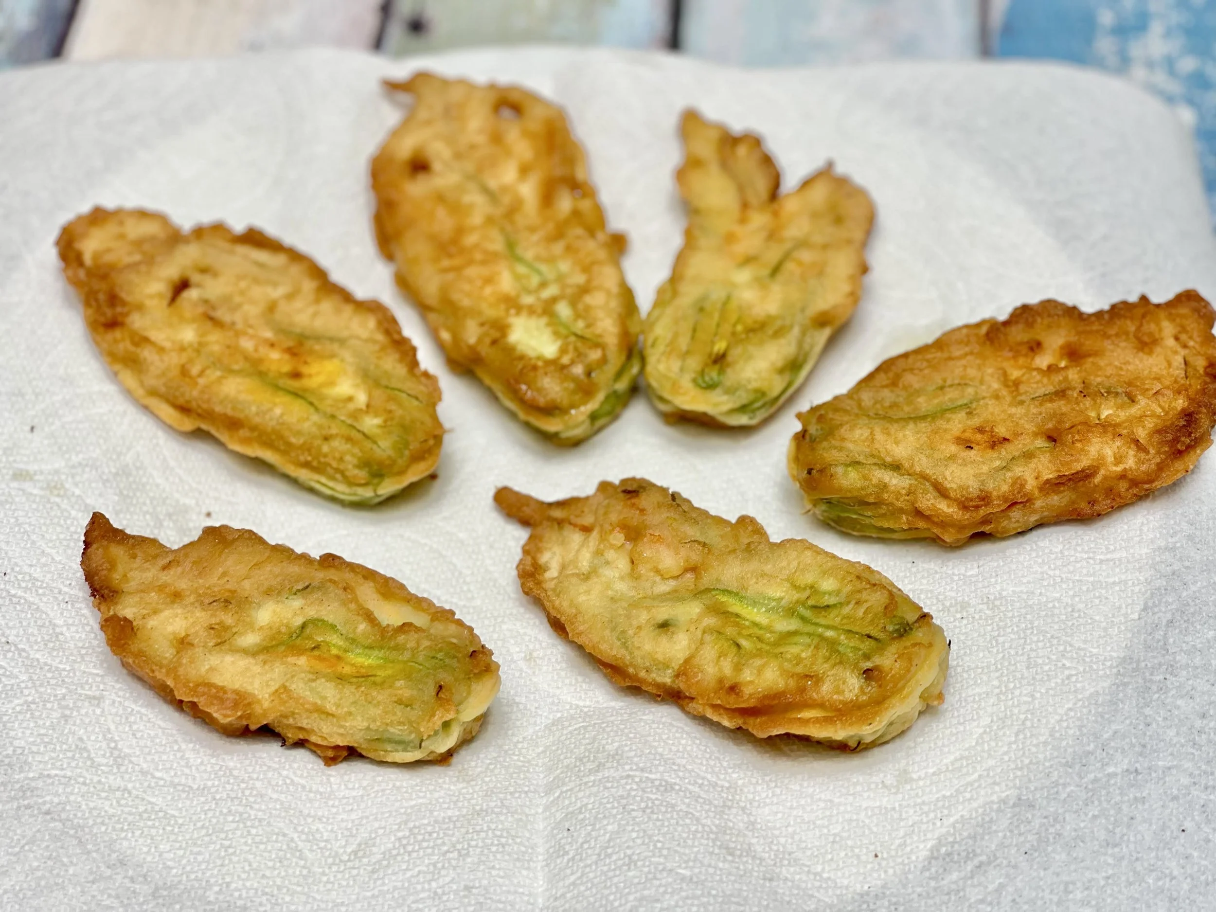 5. Place the cooked flowers on a plate covered with a paper towel. Repeat the process until all stuffed blossoms are fried.