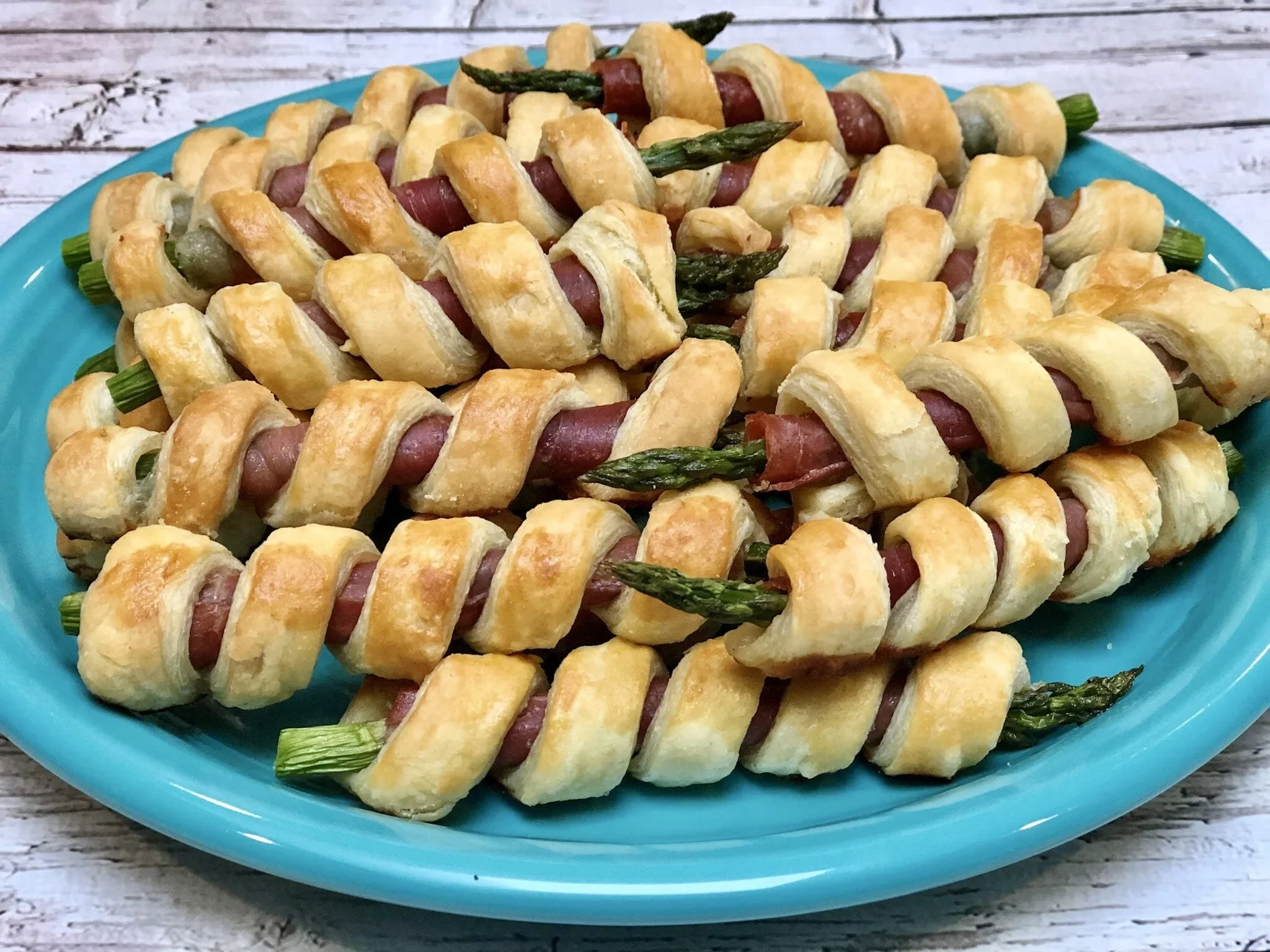 I serve them all year long, but I especially like serving these during the Christmas holidays. They have the red and green colors of the prosciutto and asparagus, and the puff-pastry wrap is like a candy cane.